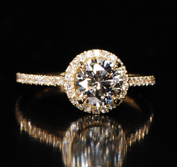Round Brilliant Cut Diamond in a completely symmetrical round halo of round brilliant cut diamonds and then the band also in even more round brilliant cut diamonds, all set in yellow gold contrasting the incredible whiteness of the center diamond.