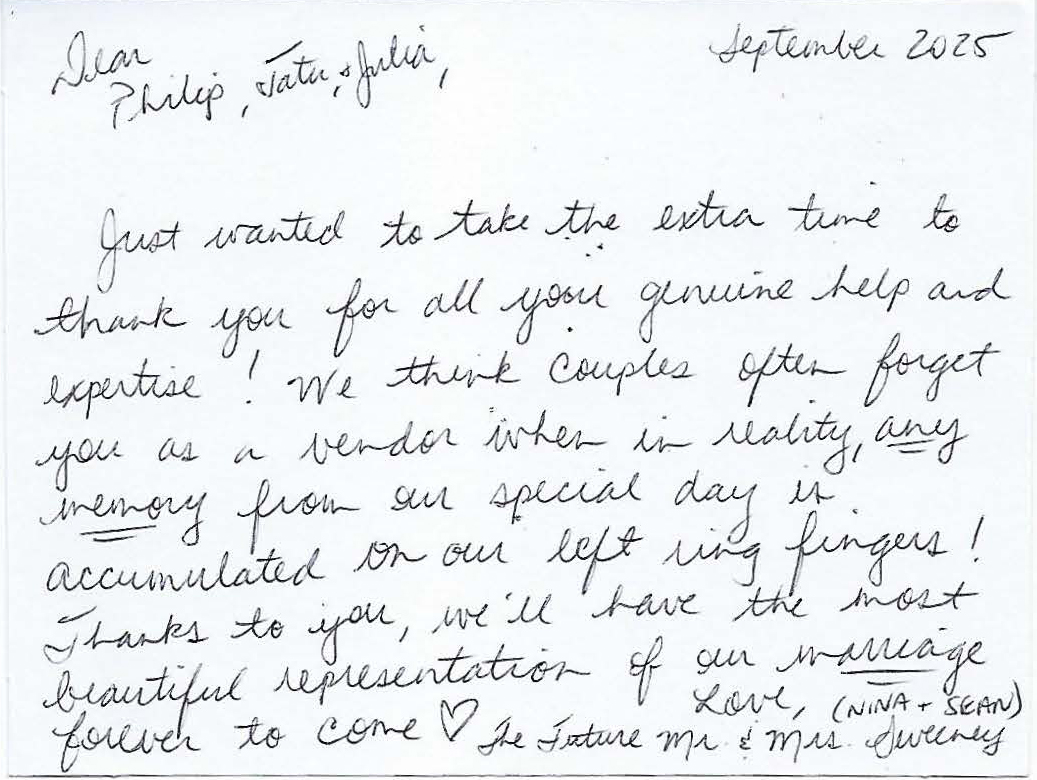 Just wanted to take the extra time to thank you for all your genuine help and expertise! We think couples often forget you as a vendor when in reality, any memory from our special day is accumulated on our left ring fingers! Thanks to you, we’ll have the most beautiful representation of our marriage forever to come ❤️